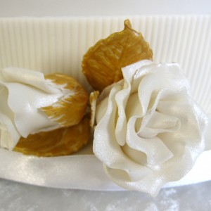 Fyld: Vanillekagebund med hvid chokolademousse og jordbær. Mandelkagebund med mørk chokolademousse med amaretto.