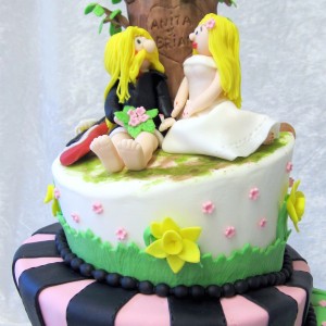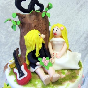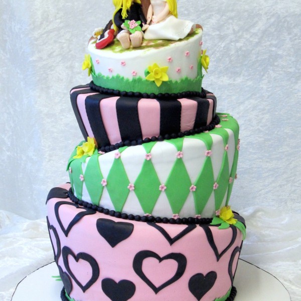 Topsy Turvy bryllupskage i 4 etager med tema “Smukfest” (Skanderborg festival), forår og kærlighed.